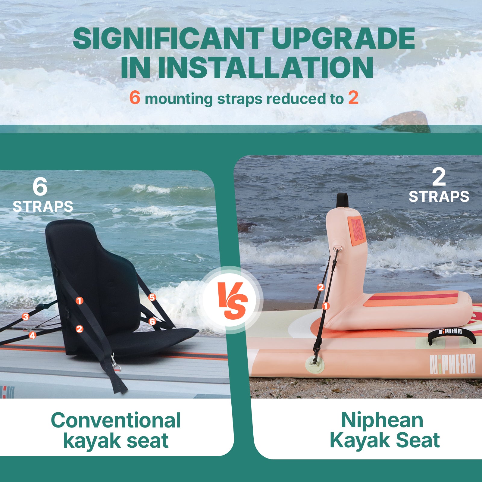 Niphean inflatable seat requires only two straps for quick and easy installation—no hassle, just secure and simple setup.